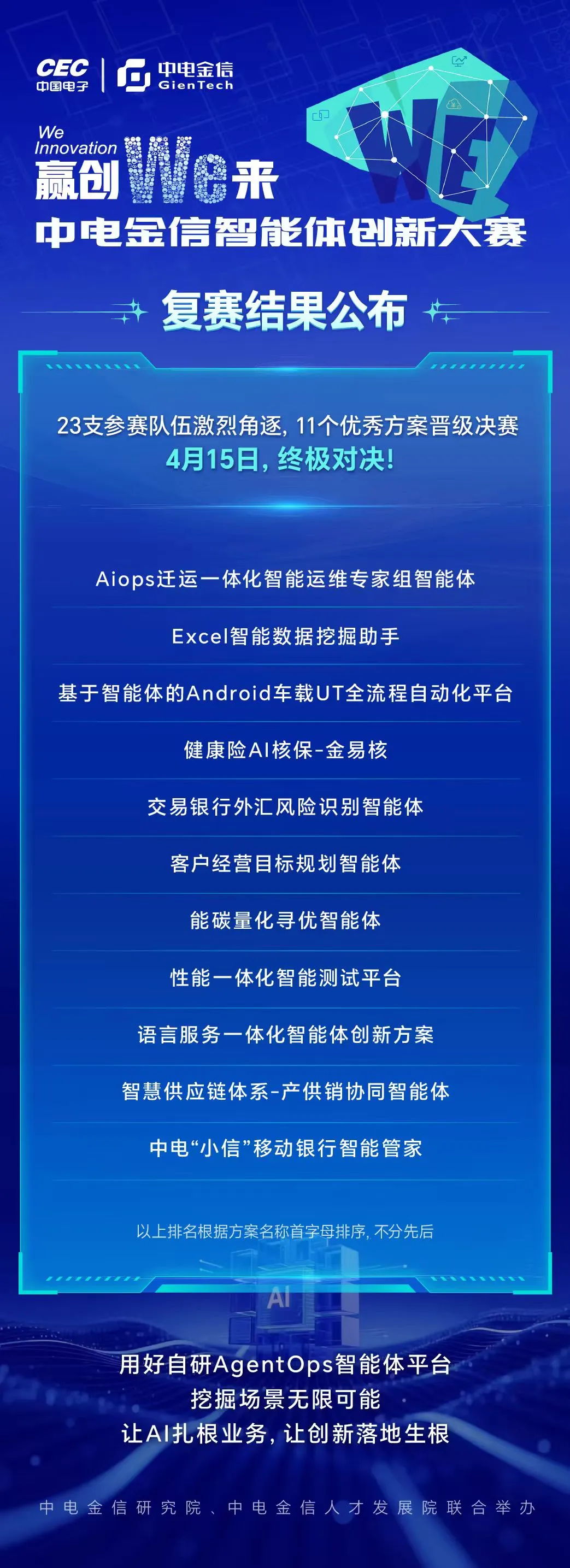 大赛总决赛将于4月15日举办,11支晋级队伍正围绕方案细节与落地路径持续打磨优化,力争呈现更具行业价值的智能体创新成果。整场赛事从预赛到复赛的稳步推进,不仅验证了AgentOps智能体平台的核心业务价值,也为公司全域AI能力的场景化落地积累了一批可复制、可推广的一线实践经验。