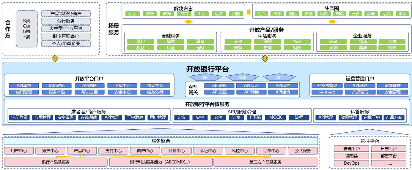 开放银行平台由场景服务、开放接入、网关服务、运营管理、服务聚合、技术支撑等多个模块组成。